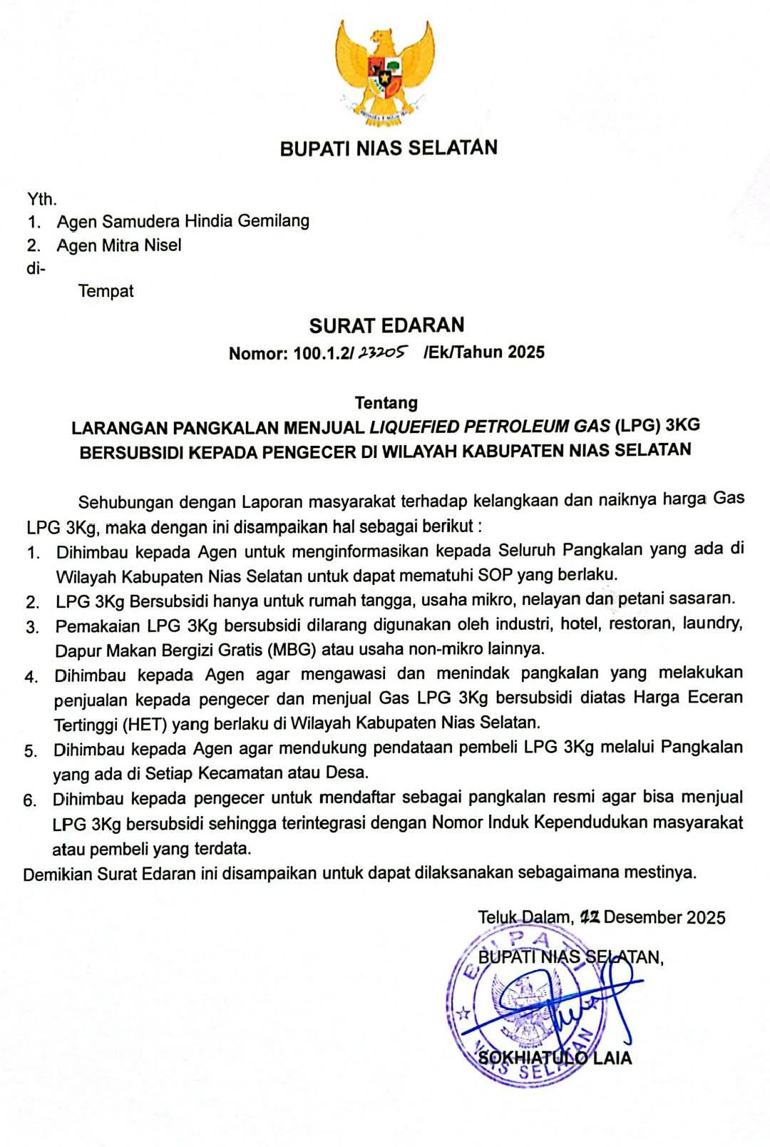 Terlampir Surat Bupati Nias Selatan kepada para Konsumen Pengguna gas LPG tabung 3 Kg terkait metode pendistribusian gas LPG tabung 3 (tiga) Kg agar tepat sasaran dan memenuhi standar volume yang berlaku.