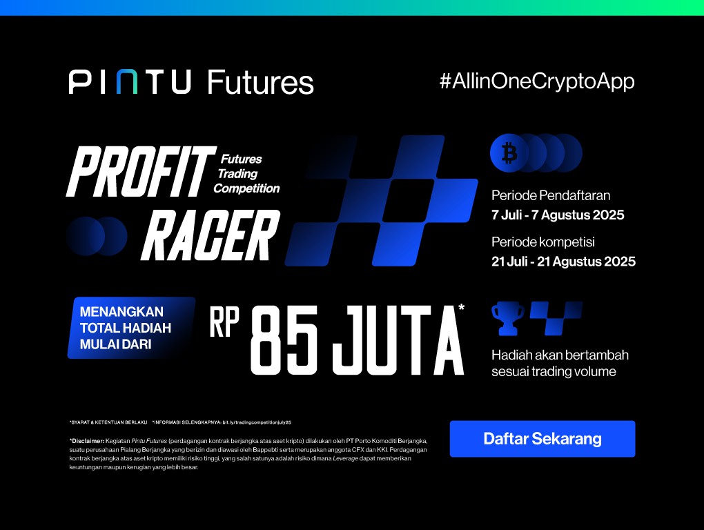 Seluruh pengguna aplikasi PINTU yang telah melakukan Know Your Customer (KYC) di Pintu Futures bisa mengikuti Pintu Futures Trading Competition: Profit Racer. Periode pendaftaran telah dibuka sejak 7 Juli hingga 7 Agustus 2025. Adapun jangka waktu kompetisi ini dimulai dari 21 Juli hingga 21 Agustus 2025. Pastikan untuk melakukan registrasi langsung di aplikasi PINTU dalam periode waktu yang ditentukan serta memperbarui aplikasi PINTU ke versi teranyar. Sebagai informasi, hingga 17 Juli 2025, sudah ada lebih dari 1.500 pendaftar yang akan mengikuti kompetisi trading ini.