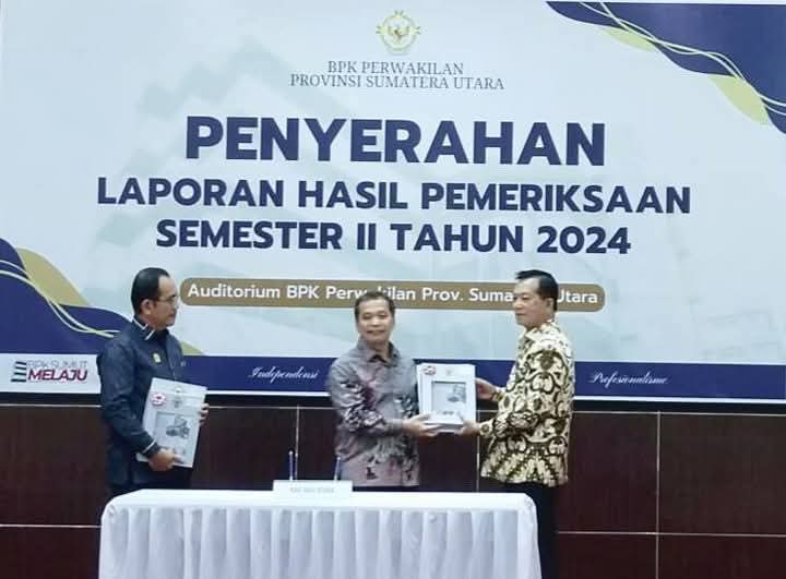 Wakil Bupati Nias Utara Yusman Zega, APi., M.Si dan Ketua DPRD Nias Utara Yaaman Telaumbanua, SE., MM, Sekda Nias Utara, Inspektur, Plt. Kepala BPKPD Nias Utara menghadiri Acara Penyerahan Laporan Hasil Pemeriksaan Semester II yang digelar oleh Badan Pemeriksaan Keuangan Republik Indonesia Perwakilan Provinsi Sumatera Utara, bertempat Auditorium Kantor BPK Sumatera Utara, Jum’at (27/12/2024).