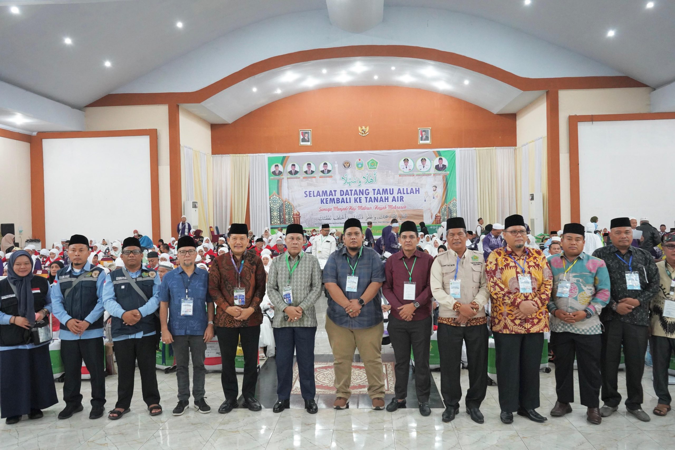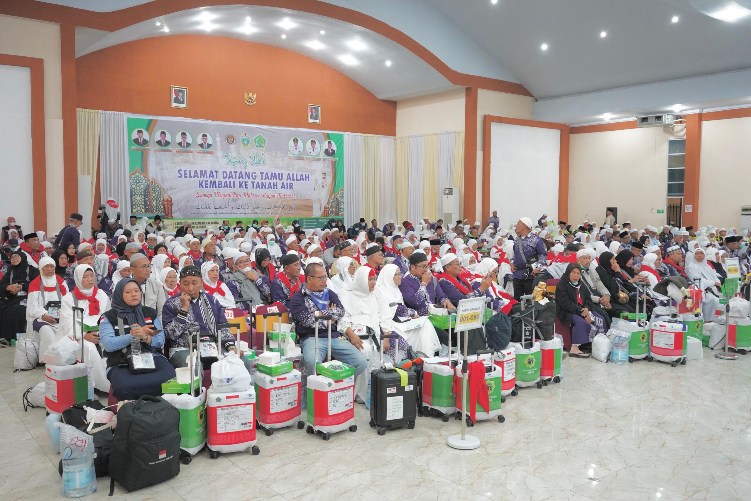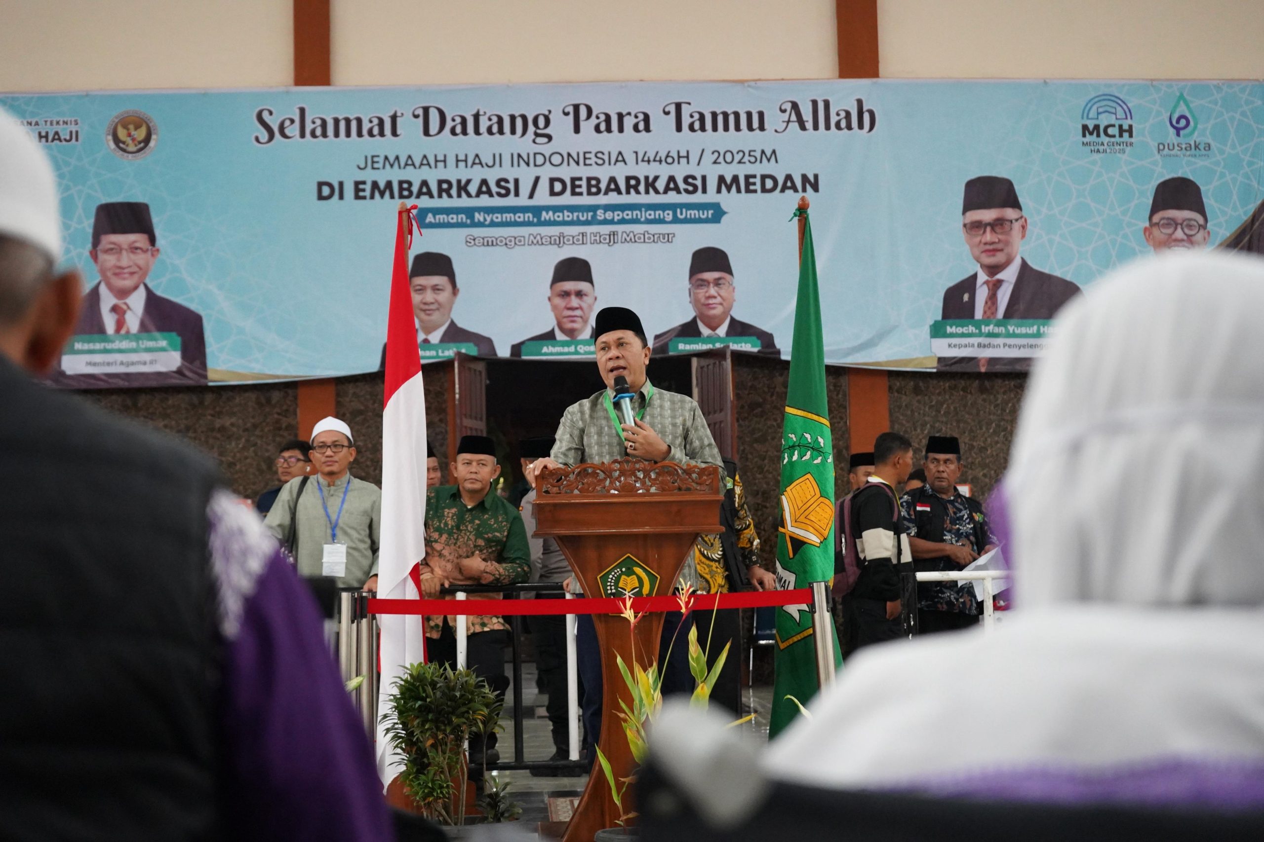 Ketua PPIH Debarkasi Medan Ahmad Qosbi saat menyambut jemaah haji di Aula Madinatul Hujjaj Asrama Haji Medan mengucapkan selamat datang selamat kembali ke tanah air, semoga segala amal ibadah yang dilaksanakan di terima Allah Swt dan diampunkan segala dosa serta semoga meraih haji mabrur.
