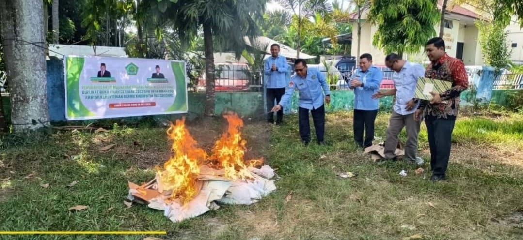 Kepala Kantor Kementerian Agama Kabupaten Deli Serdang Dr. H. Saripuddin Daulay, S.Ag., M.Pd., melaksanakan pemusnahan Barang Milik Negara (BMN) berupa kutipan akta nikah cetakan tahun 2022 dan duplikat buku nikah cetakan tahun 2023 di halaman Kantor Kementerian Agama Kabupaten Deli Serdang, Rabu (30/7/2025).
