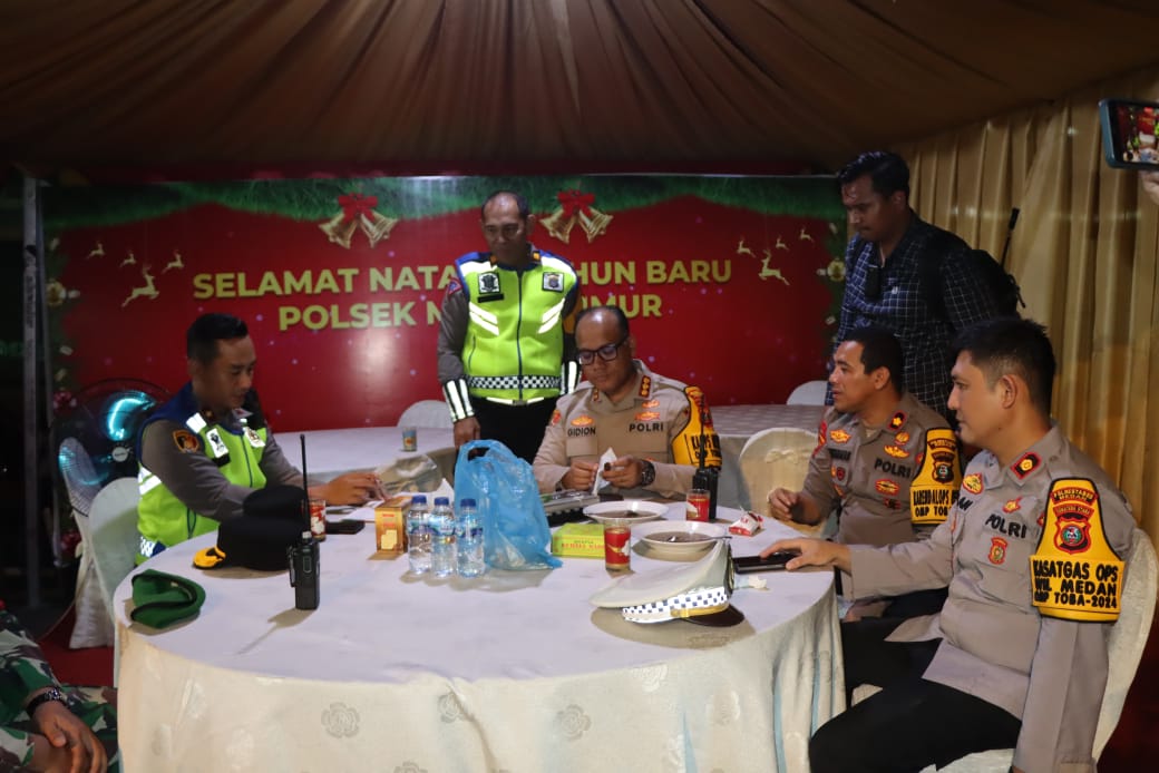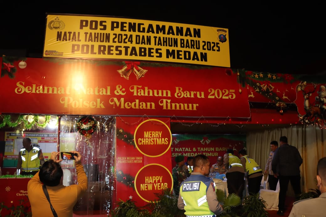 Kapolrestabes Medan Kombes Pol Gidion Arif Setyawan mengecek pos pengamanan (Pospam) Natal dan Tahun Baru (Nataru) untuk memastikan kesiapan personel dalam melaksanakan tugas dengan baik, Sabtu (21/12/2024) malam.