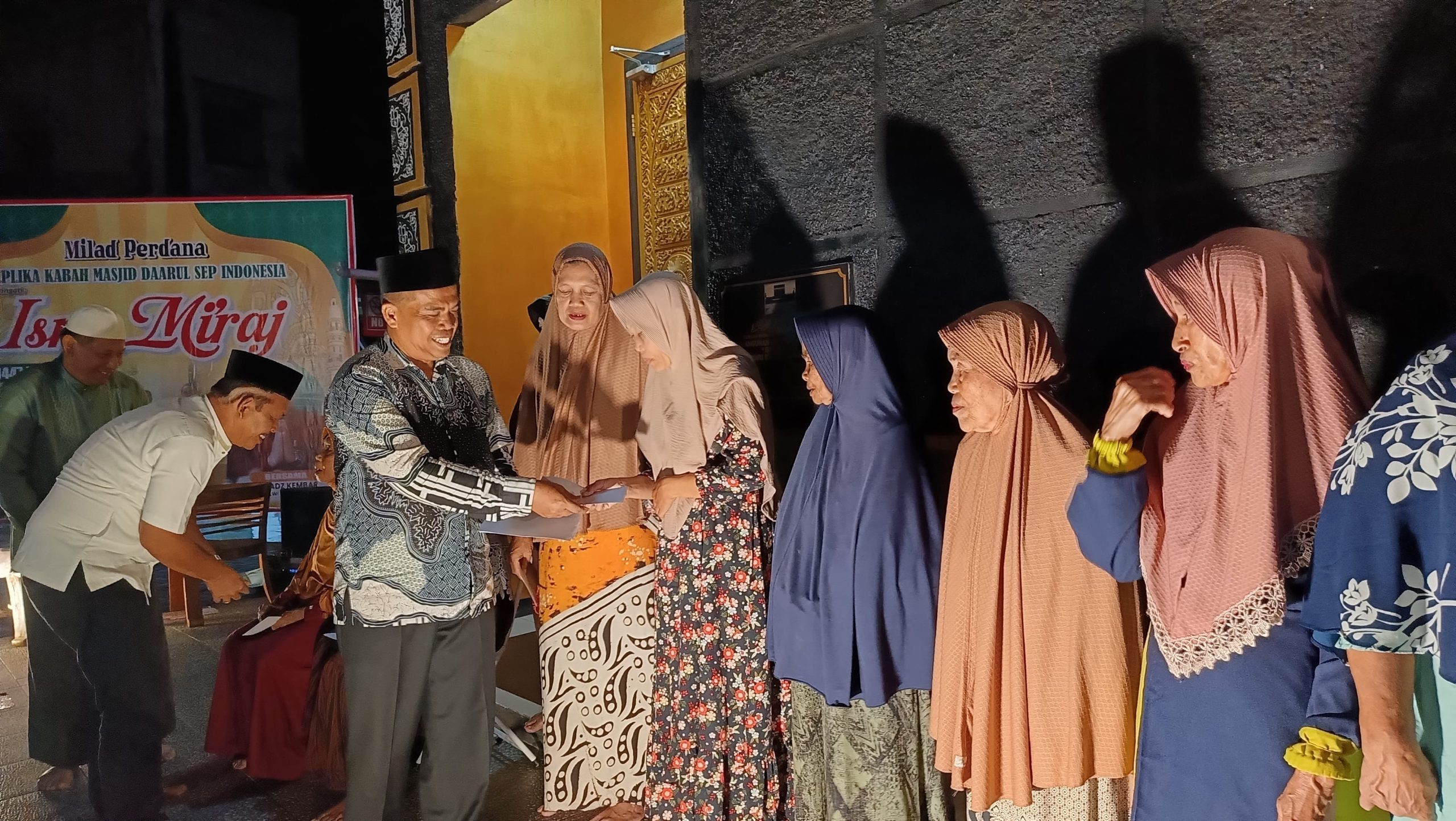 Santunan tersebut diberikan di sela-sela rangkaian kegiatan milad masjid, bersama Tim Marbot Masjid Replika Ka’bah Darul Sep.