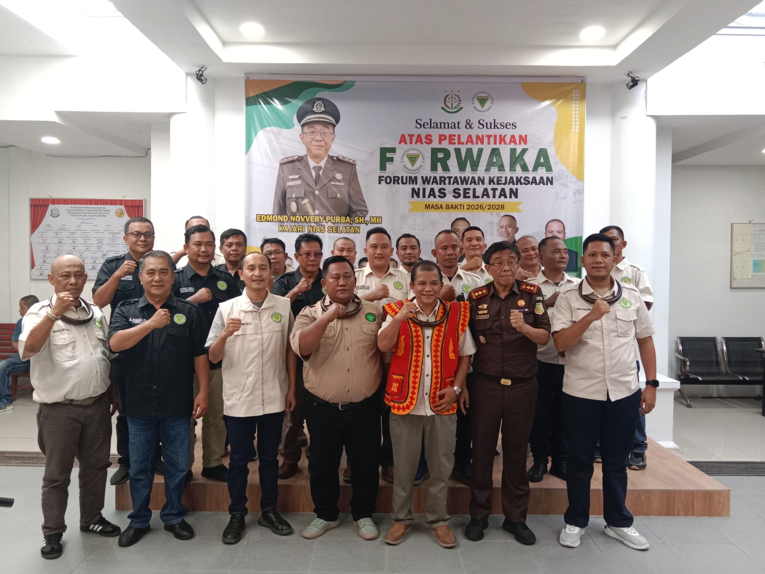Ketua Forum Wartawan Kejaksaan (Forwaka) Sumatera Utara, Irfandi, secara resmi melantik sekaligus menyerahkan surat keputusan (SK) kepengurusan Forwaka Nias Selatan periode 2026–2028 yang berlangsung di Aula Kejaksaan Negeri Nias Selatan, Jalan Diponegoro, Kecamatan Teluk Dalam, Selasa (28/4/2026).