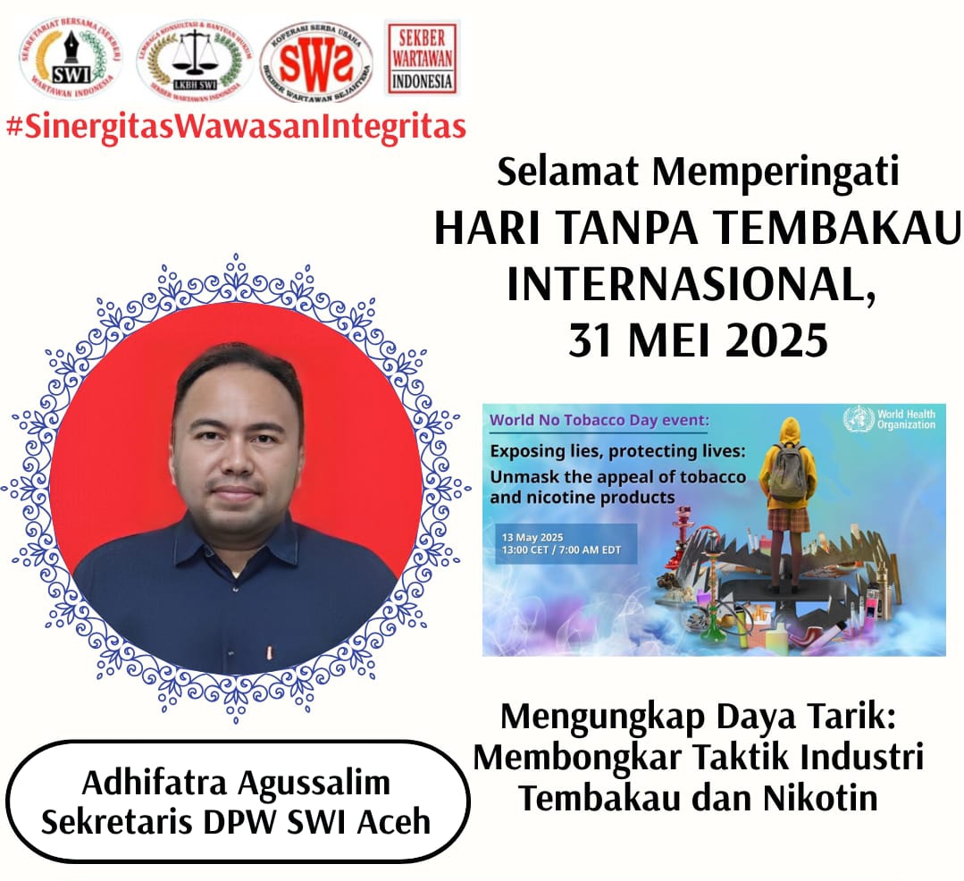 Sekretaris DPW Sekber Wartawan Indonesia (SWI) Provinsi Aceh, Adhifatra Agussalim, CIP, CIAPA, CASP, CPAM, C.EML mengajak seluruh elemen masyarakat Aceh, khususnya insan pers, untuk lebih aktif mengedukasi publik mengenai bahaya tembakau dan strategi manipulatif industri rokok dan nikotin, Sabtu (31/05/2025).