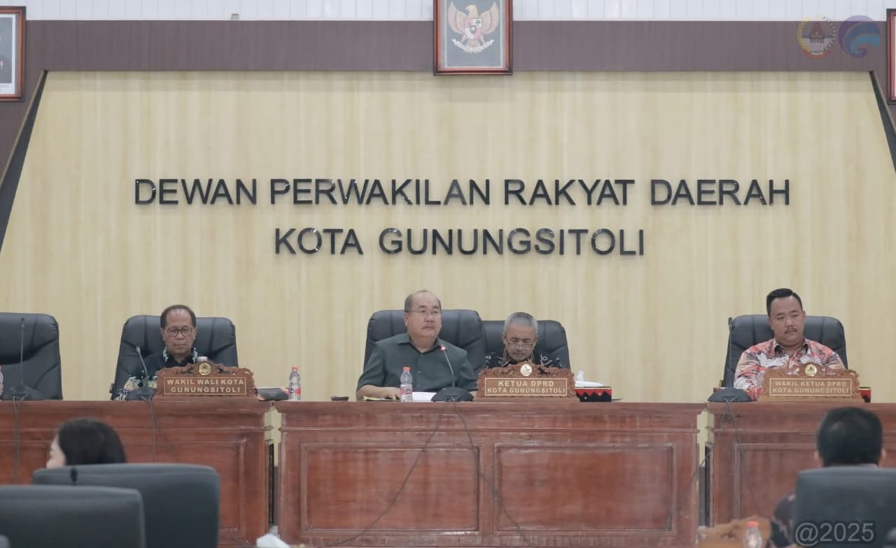 Wakil Wali Kota Gunungsitoli Martinus Lase, S.H., menghadiri Rapat Paripurna DPRD Kota Gunungsitoli dengan agenda Penyampaian Pandangan Umum Fraksi-fraksi DPRD Kota Gunungsitoli atas Rancangan Peraturan Daerah (Ranperda) Pertanggungjawaban Pelaksanaan Anggaran Pendapatan dan Belanja Daerah (APBD) T.A. 2024, dan tanggapan Pemko Gunungsitoli atas Pandangan Umum Fraksi, bertempat di Ruang Rapat DPRD Kota Gunungsitoli, Kamis (26/06/2025)