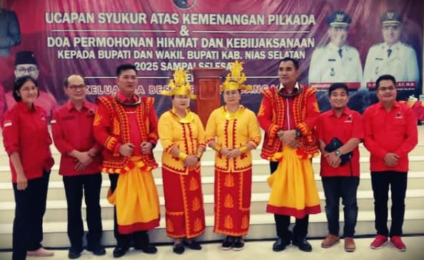 Keluarga besar PDI Perjuangan Nisel menggelar acara ucapan syukur atas kemenangan Pilkada dan doa permohonan hikmat dan kebijaksanaan kepada Bupati dan Wakil Bupati Nias Selatan, Sokhiatulo Laia-Ir. Yusuf Nache, ST.,MM, bertempat di Gedung Serba Guna BKPN, Jalan Baru, Teluk Dalam, Kamis, (6/3/2025).