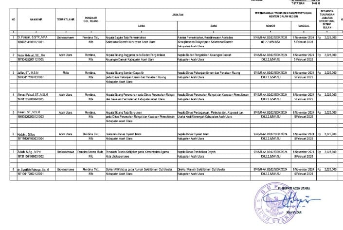 masing-masing Dr Fauzan, SSTP, MPA, dilantik menjadi Asisten Pemerintahan, Keistimewaan dan Kesejahteraan Rakyat Setdakab Aceh Utara (sebelumnya merupakan Kabag Tata Pemerintahan), Nazar Hidayat, SE, MA, sebagai Kepala Badan Pengelolaan Keuangan Daerah (sebelumnya Kabid Anggaran), Ir Jaffar, ST, MSM, sebagai Kepala Dinas Pekerjaan Umum dan Penataan Ruang (sebelumnya Kabid Sumber Daya Air), Ahmad Faisal, ST, MSM, sebagai Kepala Dinas Perumahaan Rakyat dan Kawasan Permukiman (sebelumnya Kabid Perumahan).