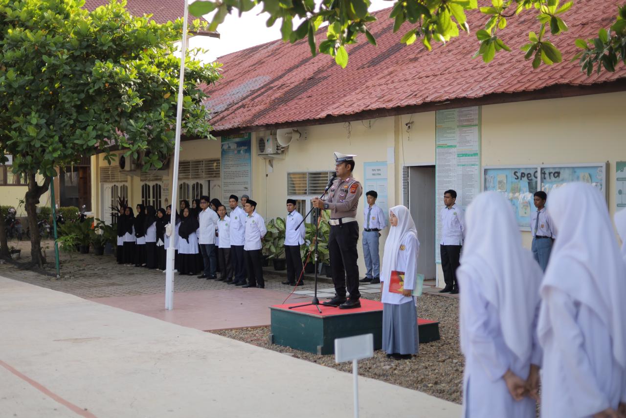 Dalam rangka Operasi Patuh Seulawah 2025, Satuan Lalu Lintas (Satlantas) Polres Lhokseumawe melaksanakan kegiatan Polisi Saweu Sikula dengan menjadi pembina upacara di MAN Kota Lhokseumawe, Senin pagi (21/7/2025).