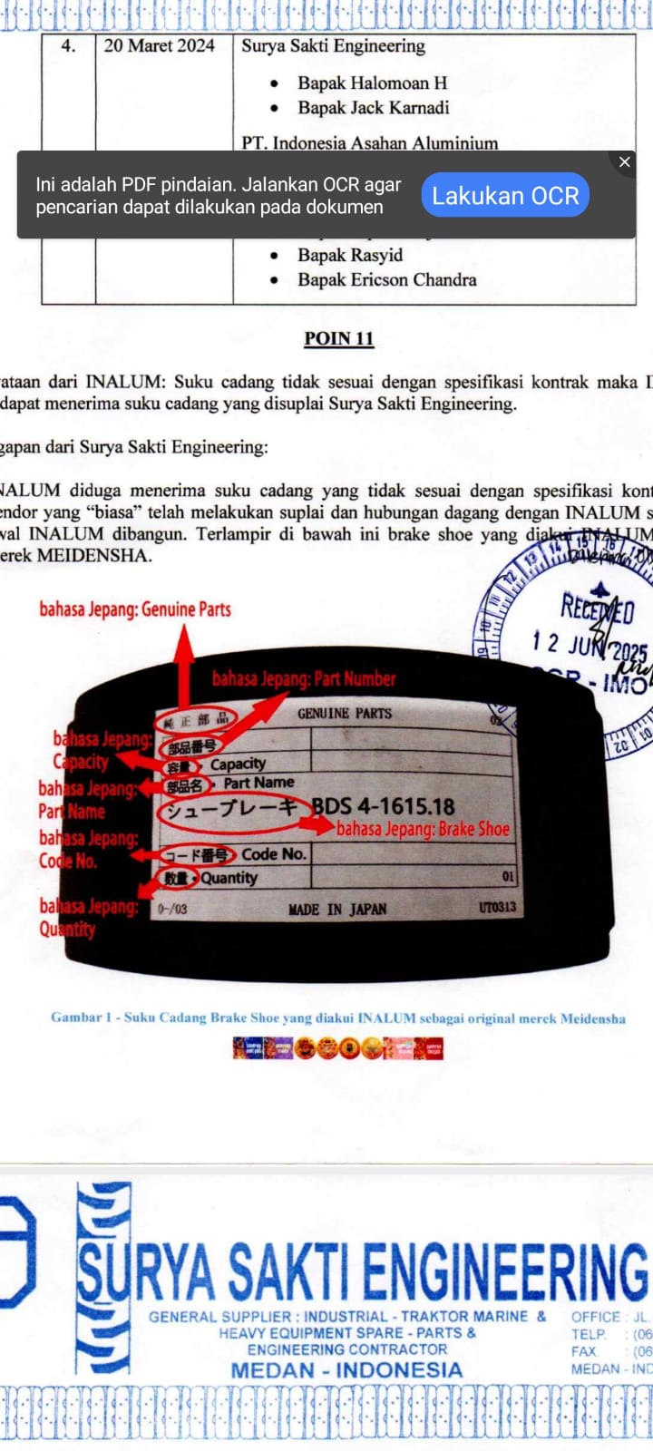 “Hal ini pun sudah dijelaskan dalam surat PT SSE. Surat penjelasan Satuma Jepang sebagai OEM Meidensha yang telah diterjemahkan ke bahasa Indonesia mengatakan bahwa barang milik vendor ‘binaan’ tersebut adalah palsu,” ungkapnya.