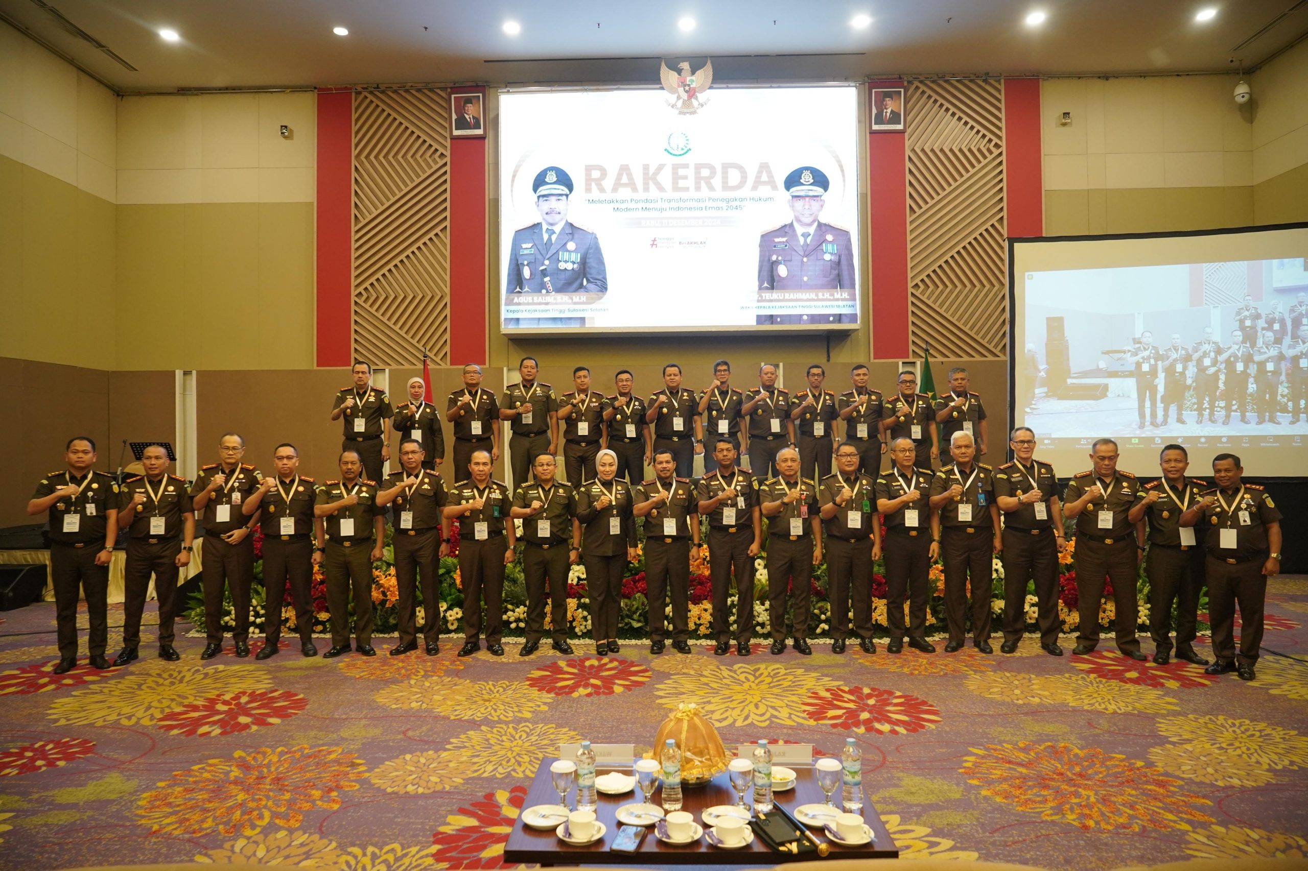 Kejaksaan Tinggi Sulawesi Selatan menggelar Rapat Kerja Daerah (Rakerda) Tahun 2024 di Hotel Claro Makassar, Rabu (11/12/2024). Rakerda Tahun 2024 ini mengangkat tema “Meletakkan Pondasi Transformasi Penegakan Hukum Modern Menuju Indonesia Emas 2045.”