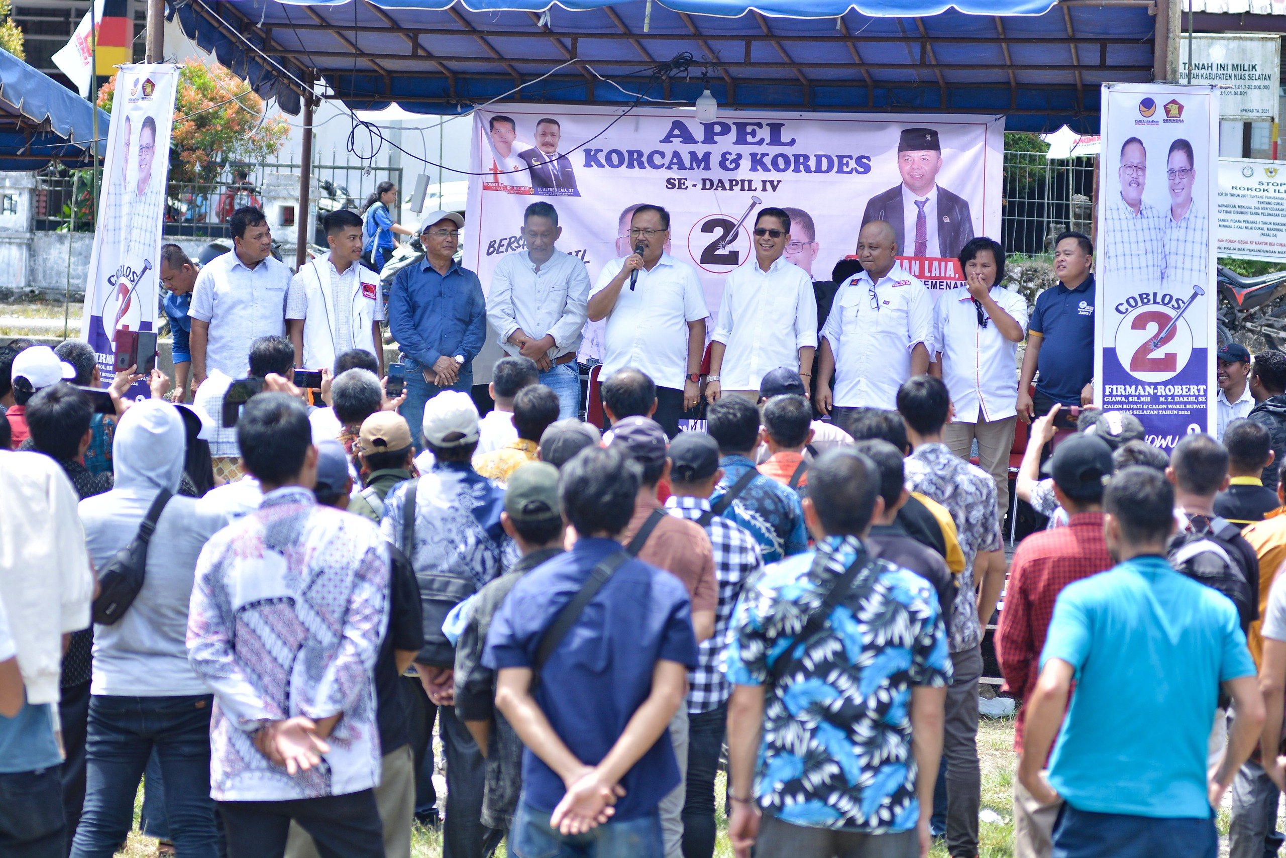 Koordinator Kecamatan (Korcam), Koordinator Desa (Kordes), relawan dan tim milenial untuk pasangan calon (Paslon) Bupati dan Wakil Bupati Kabupaten Nias Selatan (Nisel) Firman Giawa, SH.,MH dan Robert Maduwu Zolago Dakhi, SE, (Firman-Robert) dikukuhkan dan deklarasi dukungannya untuk memenangkan Paslon nomor urut 2 (Dua) tersebut pada Pemilihan Kepala Daerah (Pilkada) serentak 2024, bertempat di Lapangan Adam Malik, Kecamatan Gomo, Jumat (8/11).