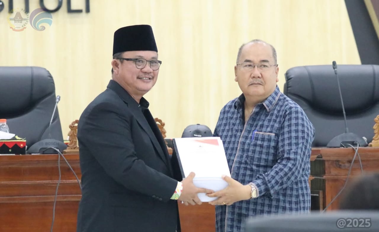 Wali Kota Gunungsitoli, Sowa’a Laoli, S.E., M.Si., menyampaikan penjelasan umum Rancangan Kebijakan Umum Anggaran serta Rancangan Prioritas dan Plafon Anggaran Sementara (KUA-PPAS) APBD Kota Gunungsitoli Tahun Anggaran 2026 dalam Rapat Paripurna DPRD Kota Gunungsitoli, Jumat (12/09/25).