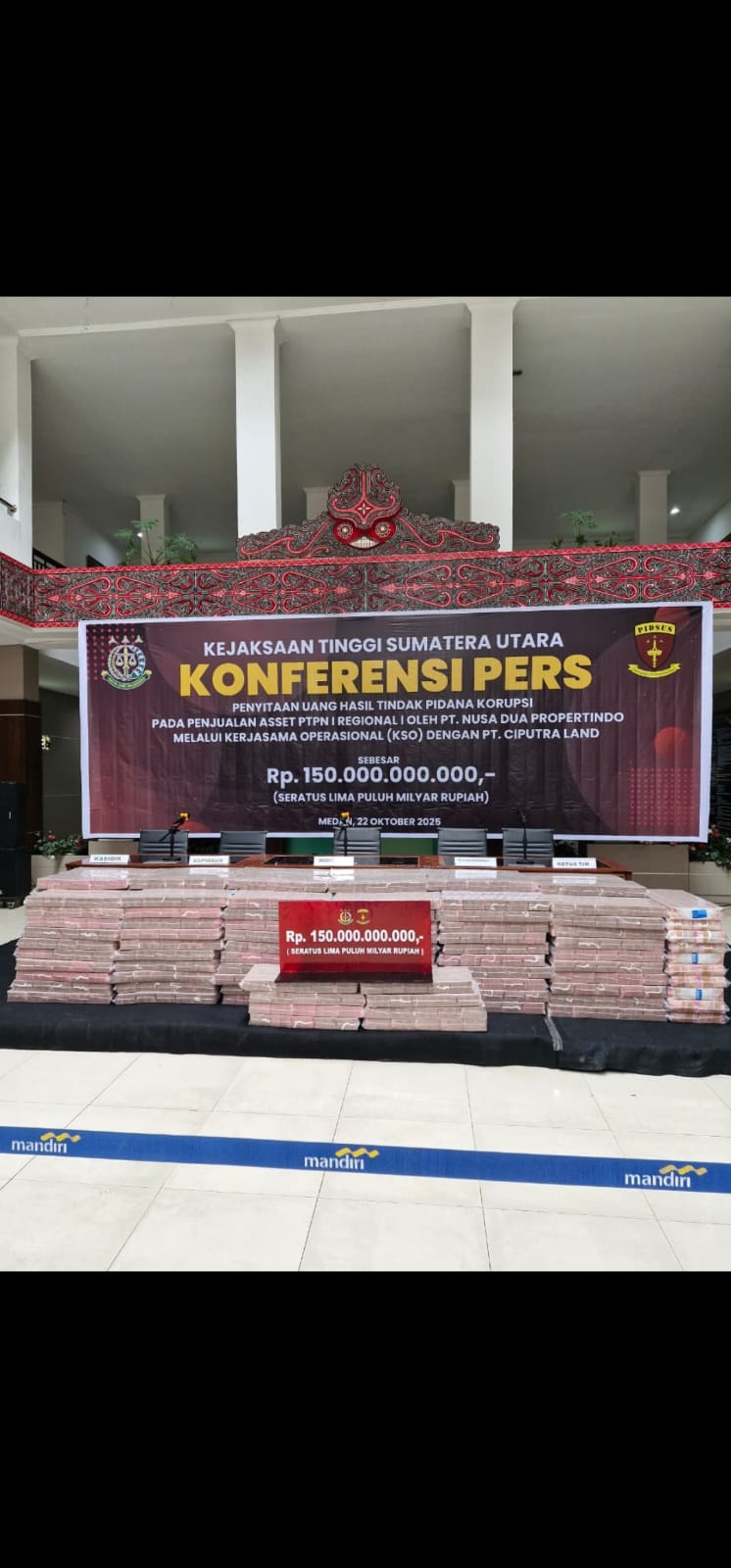 Sebagai upaya penyelamatan dan pemulihan keuangan negara dari penanganan tindak pidana korupsi Perkara Penjualan Aset PTPN I Regional I oleh PT.Nusa Dua Propertindo melalui Kerjasama Operasional (KSO) dengan PT.Ciputra Land, Tim Penyidik Bidang Pidana Khusus Kejaksaan Tinggi Sumatera Utara saat ini telah menerima pengembalian kerugian keuangan negara dari PT Deli Megapolitan Kawasan Residensial (DMKR) dengan nilai total Rp.150.000.000.000,- (seratus limapuluh miliar rupiah) untuk selanjutnya dilakukan penyitaan oleh penyidik.(22/10/25)