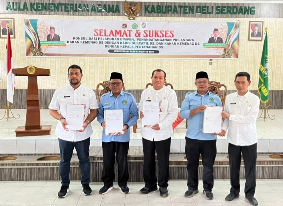 Kakan Kementerian Agama Kabupaten Deli Serdang Dr. H. Saripuddin Daulay, S.Ag., M.Pd., melaksanakan perjanjian kerja sama dengan Dinas Kependudukan dan Pencatatan Sipil (Dukcapil) serta Kantor Pertanahan Kabupaten Deli Serdang di Aula Kantor Kemenag setempat, Rabu (13/8/2025). Kegiatan tersebut dipimpin langsung oleh Kepala Kantor Kemenag Deli Serdang dan turut dihadiri Kepala Kantor Pertanahan Nasional Kabupaten Deli Serdang, Mahyu Danil, S.S.T., M.H., Kepala Dinas Dukcapil Drs. H. Misran Sihaloho, M.Si., Kasi Bimbingan Masyarakat Islam H. Mulia Banurea, S.Ag., M.Si., Kasi Penetapan Hak dan Pendaftaran Kantor Pertanahan Hamdani Azmi, S.H., M.H., serta Koordinator Kelompok Substansi Penetapan dan Pengelolaan Tanah Pemerintah Syofyana Martcianni Marpaung, S.H.