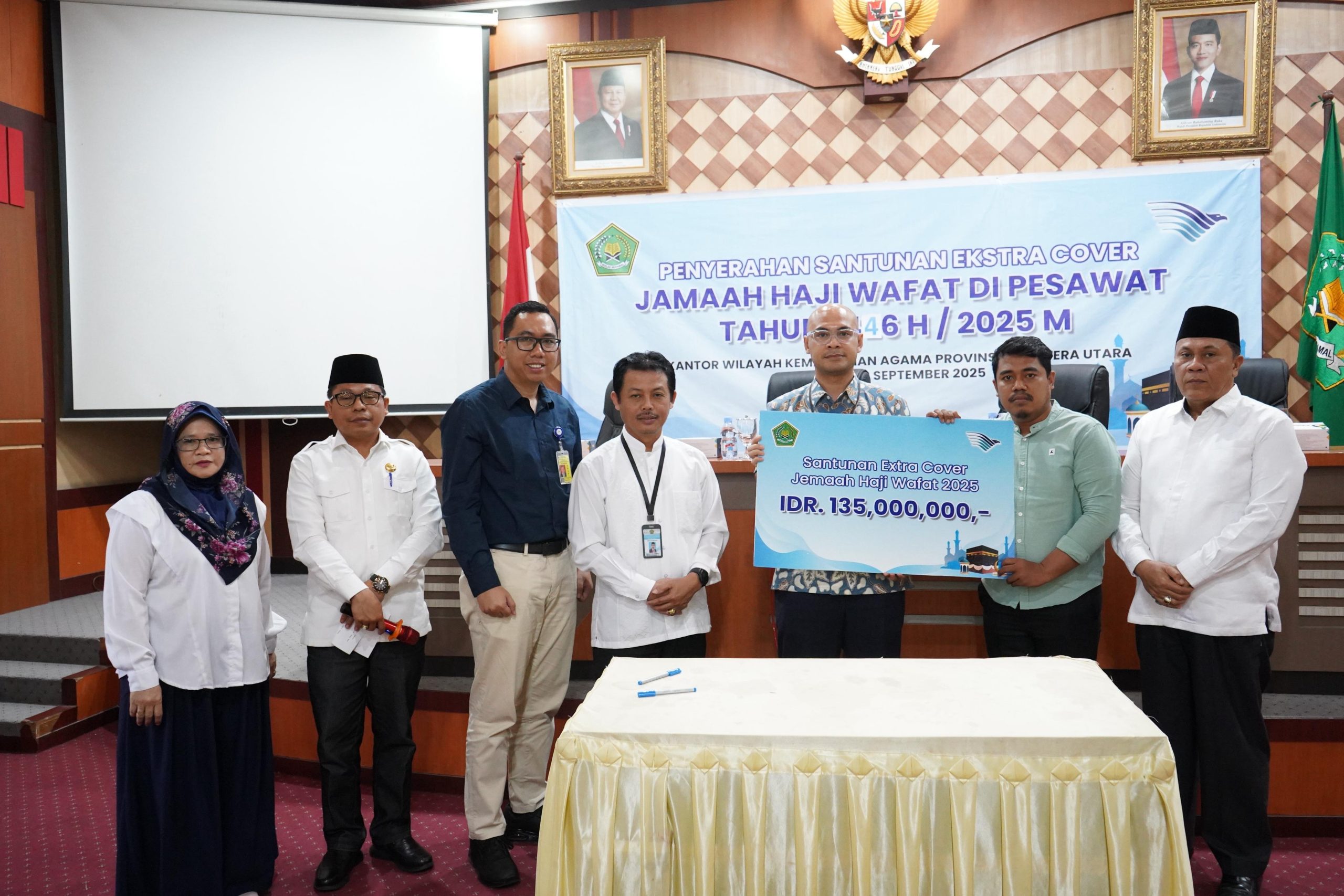 Kementerian Agama dan Garuda Indonesia menunjukkan komitmen perlindungan kepada jemaah haji melalui penyerahan santunan ekstra cover kepada ahli waris Hj. Nurmalis Binti Ujang, jemaah haji asal Kab. Deli Serdang yang tergabung dalam kloter 4 Debarkasi Medan tahun 1446H/2025M yang wafat saat berada dalam penerbangan pulang menuju tanah air.