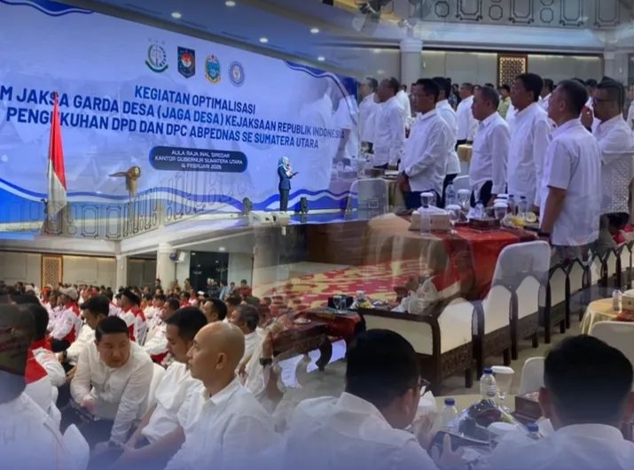 Kepala Kejaksaan Negeri Nias Selatan, Edmond N. Purba, S.H., M.H. bersama Kepala Seksi Intelijen Alex Bill Mando Daeli, S.H. dan Kepala Sub Seksi II Intelijen Marwan Syah Laia, S.H. mengikuti kegiatan Optimalisasi/Sosialisasi Program Jaksa Garda Desa (Jaga Desa) yang diselenggarakan di Aula Raja Inal Siregar, Kantor Gubernur Sumatera Utara, Sabtu (14/02/26).