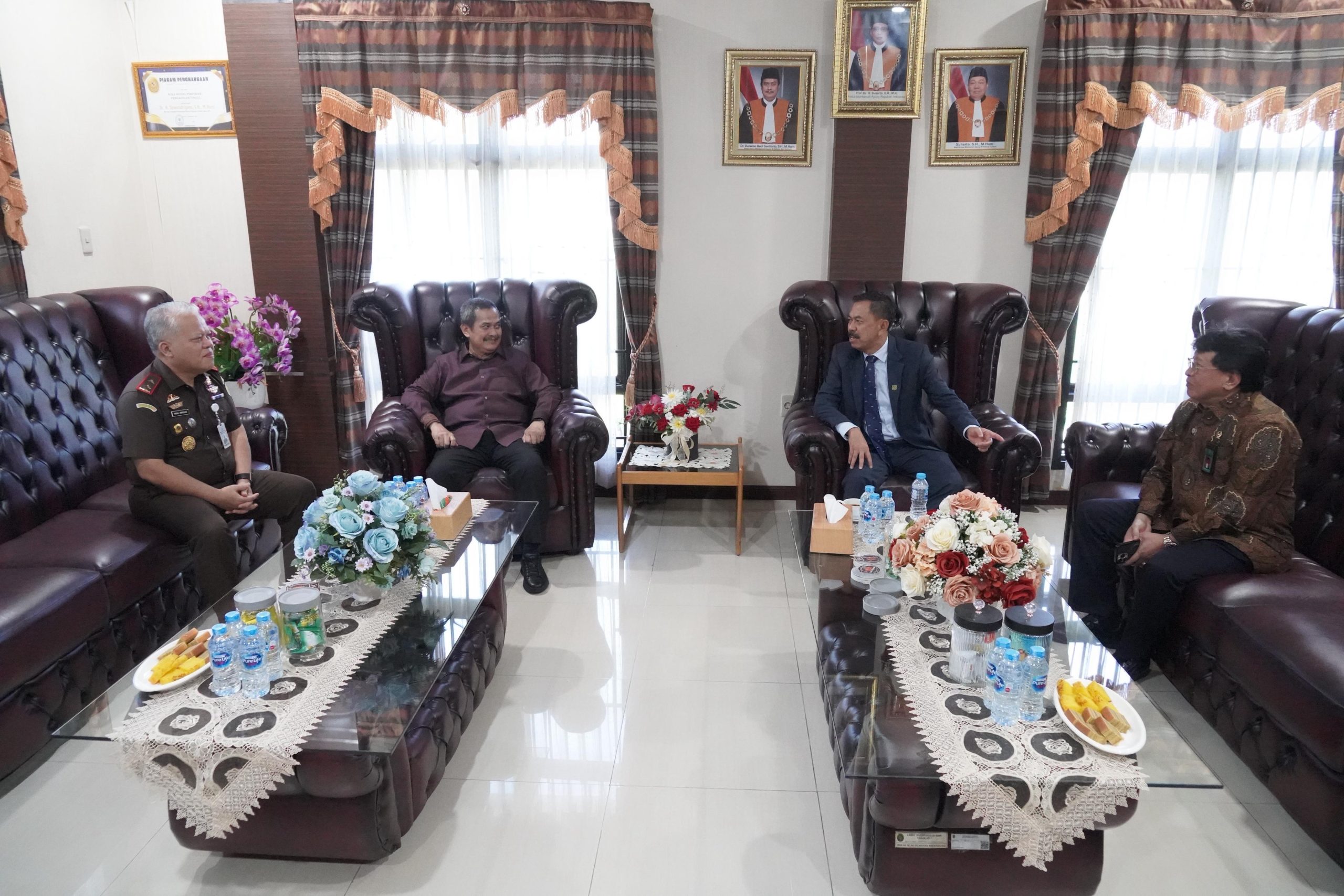 Saat tiba di kantor Pengadilan Tinggi Medan, Prof.Dr.Asep N Mulyana bertemu dan bersilaturahmi dengan Wakil Ketua Mahkamah Agung R.I Non Yudisial Dr. H. Dwiarso Budi Santiarto, S.H., M.Hum didampingi Ketua Pengadilan Tinggi Medan Dr. H. Siswandriyono, S.H., M.Hum.