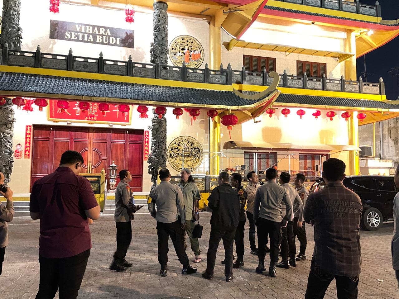 Kapolrestabes Medan Kombes Pol Gidion Arif Setyawan mengecek pos pengamanan (Pospam) Imlek 2025 di Vihara Setia Budi, Jalan Irian Barat dan Vihara Maitreya, Jalan Boulevard Raya, Kompleks Cemara Asri Medan, Sabtu (25/1/2025) malam.
